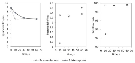 In Figure 3, we present the bacterial inactivation in liquids of two bacterial strains: Gram-negative Pseudomonas aureofaciens AP-9 and Gram-positive Brevibacillus laterosporus BT-271. At the treated bacterial density of 107 cells/mL and exposure times < 1 min, we did not achieve the complete sterilization of treated suspensions; only partial disinfection was registered. The inactivation was 99% or 2-Log reduction. The observed survival curves for both bacterial strains (Figure 3 left) have a similar biphasic shape with “tailing”. This shape is typical for spore survival curves [75] and there are several concepts for its explanation. Cerf’s model supposes the existence of subpopulations with different resistance to disinfectant; the protection role of dead cells and the products of their destruction for other more resistant cells also have an important role, maybe in combination with inactivation of bactericidal effect at depth [76]. The treatment of 10 s leads to a quick reduction in the number of Pseudomonas, but increased exposure time has no significant bactericidal effect, and the survival curve has a level tailing (a zero slope of tailing). The Brevibacillus curve has a slope tailing and the reduction of the bacterial number is smoother. The values for the bactericidal effect (Figure 3 middle) and percentage of bacteria killed (Figure 3 right) indicate that the short plasma treatment more effectively inactivates the Pseudomonas cells than Brevibacillus cells. The bactericidal effect for Pseudomonas stays around 2.3 for all studied treatment durations, but for Brevibacillus it increases with treatment time from 1.1 to 2.6. The achieved percentage of bacteria killed for Pseudomonas is more than 99% at 10 s; for Brevibacillus, this value was attained with at least 30 s.