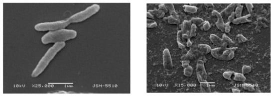 SEM micrographs of Brevibacillus laterosporus BT 271 (×5000, scanning electron microscope JEOL JSM 5510): (top left)—control; (top right)—plasma-treated sample with a duration of 30 s; (below)—plasma-treated sample with a duration of 60 s.