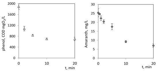 Variation in concentration of xenobiotic organic compounds—phenol, measured as COD (left), and amaranth (right)—after cold plasma treatment.