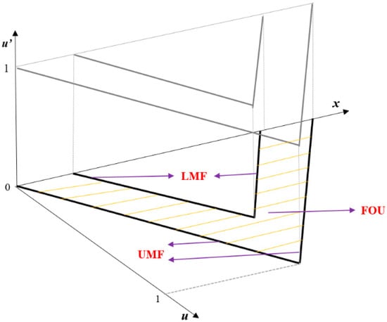 The membership function of IT2FLC is different from that of T1FLC. As shown in Figure 3, the value of the main membership function (MF) on the two-dimensional plane is an area (shaded area), which is contained by LMF (Lower Membership Function) and UMF (Upper Membership Function) and is called FOU (Footprint of Uncertainty). LMF and UMF are represented by and , respectively, so can also be expressed as