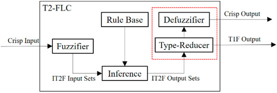Figure 4 shows the structure of IT2FLC. Compared with T1FLC, there is one more step: type reduction. Its function is to convert the T2FS output by fuzzy inference into T1FS, and then perform defuzzification calculation. Other processes are similar to T1FLC.