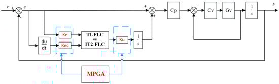 Based on the above discussion, this paper constructs an IT2FLC-DHTC system as shown in Figure 5. Based on the original double closed-loop control system, a branch of FLC with integrator is connected in parallel. The FLC judges the system error and the rate of error change. The output of FLC is the gain of the integrator. The input and output scaling factors of FLC are iteratively optimized by MPGA.