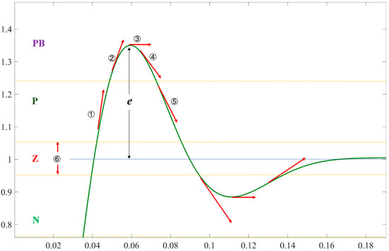 Before setting up the fuzzy rule base, the judgment mechanism of type switching should be analyzed. Through a large number of previous experiments, it is found that when e is large, the access integrator can easily lead to system divergence. When ∆e is large, the system error will change rapidly; at this time, the interruption of integrator should be handled carefully, otherwise the system divergence will easily occur. When e is near the steady-state range, the access of the integrator should be avoided as much as possible; because there is noise in the actual system, its ∆e is irregular. In this case, it is easy to connect the integrator and cause the system to deviate from the balanced position again. When e is in P and N state, it is the best time to connect the integrator, which can achieve a significant correction effect under the premise of system stability. Finally, the mechanism for determining type switching is shown in Figure 7, when e and ∆e are in six states in the figure:
