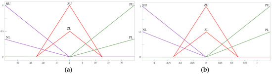 Let be a type-2 fuzzy set (T2FS), is the primary membership degree of , and is the secondary membership degree of . When is always 1, the calculation amount of fuzzy inference can be greatly simplified. At this time, T2FLC is called interval T2FLC (IT2FLC). When is input, can be expressed by Equation (6):