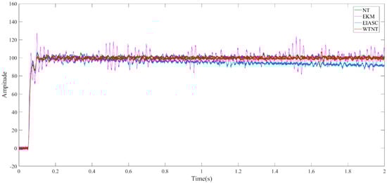 Figure 15 and Table 7 are comparisons of the three TR algorithms of NT, WTNT, EKM, and EIASC. EKM and EIASC apply the principle of iterative optimization to find the optimal solution, which is more complicated than the WTNT algorithm. From the response results, under the same parameters, both NT, WTNT, and EKM can ensure the stability of the system, but EKM will bring greater jitter, and the values of VAR and ITAE are large and unstable, while EIASC diverges the step response and does not apply to this experimental platform. Comparing NT and WTNT, we can see that the WTNT algorithm has a faster response speed and higher steady-state accuracy. Meanwhile, the VAR and ITAE values of WTNT are smaller than NT, indicating that the WTNT algorithm has stronger robustness.