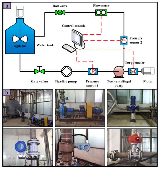 The two-phase mixture-transportation test bench is shown in Figure 1. A pressure gauge was set at a distance of 4d1 from the inlet of the centrifugal pump (d1 is the inlet pipe diameter) and a distance from the pump outlet of 2d2 (d2 is the outlet pipe diameter) to measure the pressure and monitor the head change of the centrifugal pump. Additionally, for the experiment, a SIN-PX400 pressure sensor with high measurement accuracy was chosen. The measurement of this sensor could be accurate from ±0.1%–±0.25%. According to the pressure change range in the test bench, the range of the inlet pressure sensor was −0.1–0.2 MPa, and the range of the outlet pressure sensor was 0–0.6 MPa. A torque meter was set between the drive motor and the centrifugal pump to measure the torque and the speed of the centrifugal pump shaft for calculation. A torque meter was set up between the driving motor and the centrifugal pump to measure the torque and speed of the centrifugal pump, so as to calculate the power and efficiency of the centrifugal pump. The speed range of the torque sensor selected in this experiment was 0–6000 r/min. In this experiment, the KROHNE electromagnetic flowmeter OPTIFLUX2300C was used to measure the flow of the flowing medium, which allowed the fluid to contain solid particles with a mass fraction of up to 12%. Because the solid-liquid two-phase wear experiment of the centrifugal pump lasted for a long time, the heat generated during the experiment increased the water temperature and affected the accuracy of the experiment. Therefore, the experimental system used in this research was an open experiment bench to improve the heat dissipation effect. The wear test time for each working condition was 48 h.