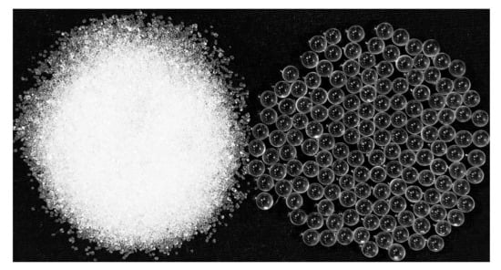A centrifugal pump model HCK100-80-250 was used in this study and its rated flow rate was 70 m3/h, head was 14 m, and speed was 1450 r/min. The particles selected for the experiment are shown in Figure 2. The materials were glass, the density was 2700 kg/m3, the shape was round, the diameters were 3 mm and 0.3 mm, and the hardness was 6.5 Mohs. In order to simulate different particle-crushing conditions, the original single-particle size solid–liquid two-phase flow was replaced with a two-particle size solid–liquid two-phase flow that was mixed by using the initial large particles and broken small particles according to the ratio. These were regarded as the particles before being broken, and the particles with small diameters were regarded as the particles after being broken. According to Table 1, the particle compositions were divided into three working conditions. At the same time, by comprehensively considering the transportation efficiency and passability, a particle mass concentration of 7% was selected for the study.