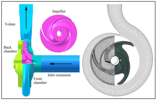 In order to find the appropriate number of computational meshes, eight sets of meshes with the numbers of nodes gradually increasing from 460,426 to 3,561,073 were drawn. These eight sets of meshes were simulated and analyzed separately, and the results are shown in Table 3. Considering the accuracy of the simulation and the calculation time, the mesh number of 2,427,310 was selected for the numerical simulation. The three-dimensional assembly model and mesh diagram of the centrifugal pump are shown in Figure 3.