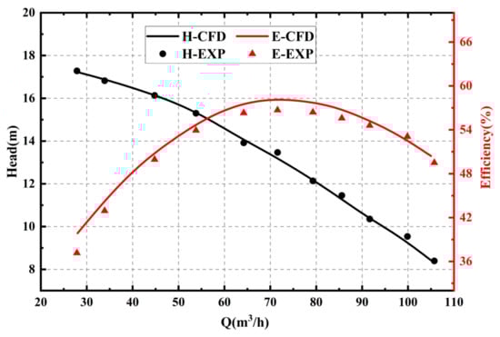 The particle injection method on the inlet surface was carried out in the form of file form, and 64 particle injection points were evenly arranged on the inlet surface. The incident velocity of particles is the same as that of fluid; both are 2.47 m/s. Mesh motion is used in an impeller zone, and its rotational speed is 1450 r/min, which is the same as the actual experimental speed. The boundary conditions in the simulation are set according to the actual experimental conditions. In the simulation, the time step was set to 0.00011494255 s, which was the time required for the impeller to rotate through 1°. The convergence criterion for the residual values at each time step was set to 10−4.
