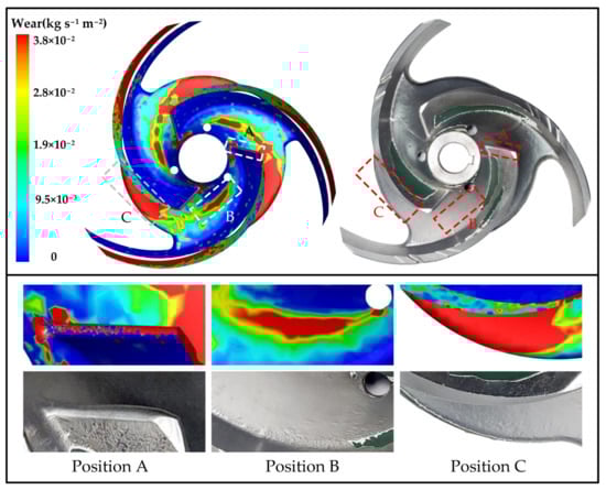 For verifying the validity of the numerical simulation method, the numerical simulation results were compared with the experimental results. Figure 4 shows the head and efficiency comparison between the numerical results for the ratio of large particles to small particles of 3:7 and the experimental data. Based on the comparison of the experimental value and the calculated value shown in the figure, the change trend of the two was basically the same, and the experimental value of the efficiency was generally smaller than the calculated value. This was because the power loss caused by the volume leakage and the mechanical friction was not considered in the numerical calculation. Additionally, due to the influence of the experimental uncertainty, the experimental curve jumped slightly, while the calculation curve was relatively smooth. The maximum error of the head at the rated flow rate was 3.01%, and the maximum error of the efficiency was 7.23%. This result was within a reasonable error range. Figure 5 shows the simulation and experimental results of PSD2 (particle size distribution) with a ratio of large particles to small particles of 7:3. From the simulation results in the figure, it can be seen that the severe wear areas of the impeller were mainly concentrated at the position of the blade head (position A), the hub wall at the center line of the two blades (position B), and the outer edge of the impeller hub wall near the pressure surface of the blade (position C), which were consistent with the results obtained from the wear experiment. The qualitative analysis showed that the simulation results were in good agreement with the experimental-impeller wear conditions. Based on the above results, the numerical simulation results could be considered reliable.
