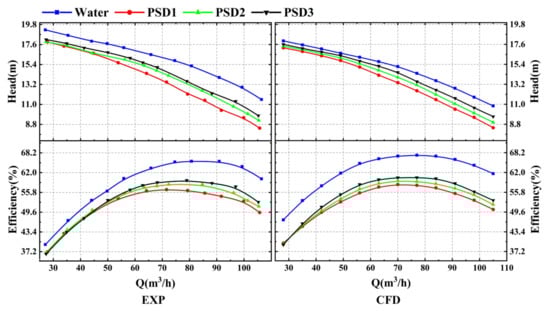 In order to study the effects of different particle size components on the performance of the centrifugal pump, a performance comparison experiment for the three component particles with the same mass concentration of 7% was designed, and the relevant numerical simulation calculation was carried out based on the experiment. The experimental and numerical simulation results are shown in Figure 6.