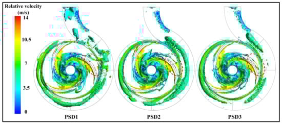 Figure 7 shows the vortex core diagram under the working conditions of three particle components when the rated flow rate is Q = 70 m3/h and = 0.52. It can be seen from the figure that the vortices of the three working conditions were not very different at the entrance section of the impeller channel. With the disturbance of the leading edge of the blade, a large number of vortices were generated at the entrance of the impeller. As shown in the red circle at the end of the pressure surface of the blade in the picture, the vortex generated by the PSD1 working condition with all 3 mm particles had entered the volute channel, and the vortex core generated at this position in the PSD2 working condition was still near the trailing edge of the pressure surface. The PSD3 working condition had not yet produced the vortex core at that position. This was mainly because compared with the 0.3 mm particles, the 3 mm particles were less random in the flow field. With the influence of gravity and the inertia force, the particles accumulated at the trailing edge of the blade- pressure surface. Moreover, due to the coupling effect of the particles and the fluid, the flow field there was more chaotic. At that time, compared with the other working conditions, the vortex core was pushed into the volute flow channel in advance by the accumulated particles. At the same time, part of the volute was observed. With the increase in the small particles in the particle composition, the number of vortexes in the volute gradually decreased and the strength of the vortex gradually weakened. That is, when the particle-mass concentration was the same, the increase in the proportion of small particles in the particle component could suppress the generation of vortices in the flow field and stabilize the internal flow field, while a relatively stable flow field could improve the pump head and operating efficiency. This is similar to the turbulence-limiting hypothesis proposed by Zhang [32], who believes that due to the ability of silt particles to limit turbulence, the turbulent structure and turbulence intensity in muddy water are smaller than those in pure water, resulting in a small resistance loss.