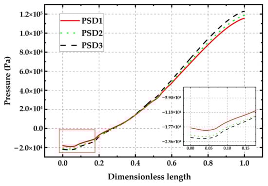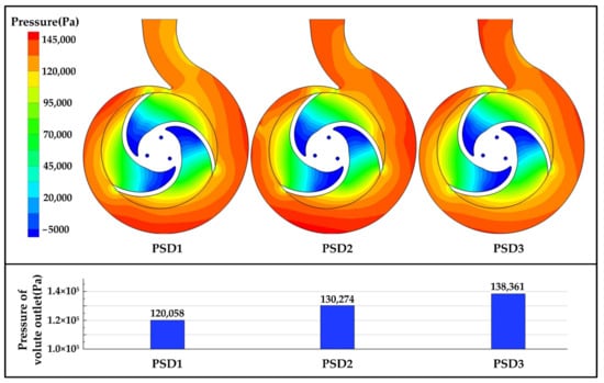 It can be seen from Figure 8 that at the rated flow rate Q = 70 m3/h, the pressure distribution of the centrifugal pump was different when the centrifugal pump was transporting particles of different components. The pressure trend of the working condition for each component particle from the inlet to the outlet of the impeller increased. With the increase of the 0.3 mm small particles in the particle component, the trend of the pressure increase was more circumferential; that is, the pressure increase was more uniform, indicating that with the increase of the number of small particles in the particle component, the flow field in the impeller passage tended to be stable, which helped to reduce the efficiency loss of the centrifugal pump. At the same time, it can be observed that from PSD1 to PSD3, the pressure value at the outlet of the volute rose gradually, indicating that the change of the particle composition had a great influence on the pressure at the outlet, which was also one of the reasons why the pump head increased when the number of small and medium particles in the particle composition increased.