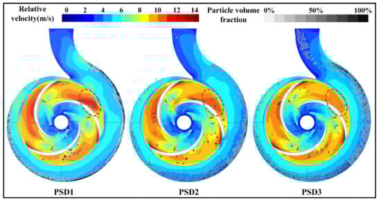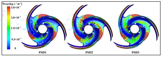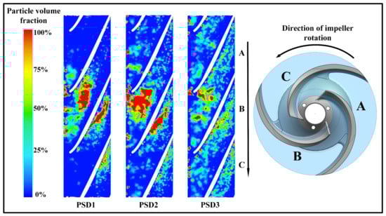 In order to study the reasons for the differences in the impeller wear caused by different particle components, the particle-volume distribution diagrams of the cascade span of 0.5 under three different working conditions were compared and analyzed. It can be seen from Figure 11 that the particles were mainly distributed in second flow channel A. This was mainly because the particles were affected by gravity and began to accumulate in the lower part of the flow channel before entering the impeller. In the PSD2 condition, 30% of the particle components were replaced by small particles, which were distributed in all three flow channels. In second flow channel A, higher local particle aggregation occurred than in the PSD1 condition. In the PSD3 condition, the particle distribution in the three flow channels had showed little difference.