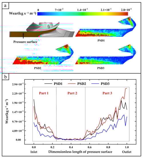 It can be seen from Figure 12 that when the rated flow rate (Q) was 70 m3/h, except for the different wear rates, the distribution area of the wear area on the pressure surface of the blade was basically the same. The most serious wear under different working conditions generally occurred on the leading edge and the trailing edge of the blade. Nearby, the middle section of the pressure surface also exhibited wear, but the wear of these parts was relatively light. As shown in Figure 12a, at the blade-head position, the wear area of PSD2 was the largest, that of PSD1 was the second largest, and that of PSD3 was the smallest of the three. However, it can be found from Figure 12b that the average wear rate of PSD1 at the head of Part 1 of the blade-pressure surface was the highest among the three working conditions. This was because in the PSD1 working condition, the particle components were all 3 mm larger. The particles were greatly affected by inertia. The particles directly hit the head of the impeller at a large relative speed, causing comparatively serious erosion and wear. The PSD2 working condition had 30% small particles, and the distribution ratio was for the particles when they entered the impeller. The dispersion of PSD1 occurred because the wear area was larger than that of PSD1, but the average wear rate was less than that of PSD1. However, as shown in Figure 12b, the average wear rate of the pressure-surface tail of the PSD2 blade was greater than that of the PSD1 condition. This was because of the pressure surface of the blade in the tail region. Due to the rotation of the impeller itself, particles gathered there to form a local high concentration. At the same time, the small particles in PSD2 filled the large-particle clusters and formed a higher concentration than PSD1 at the same position. The particles aggregated, so the average wear rate of PSD2 was greater than that of PSD1.