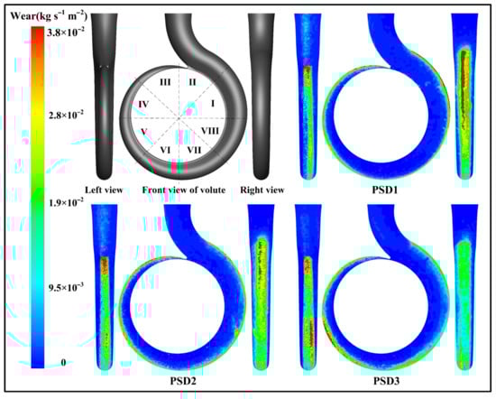 The fluid in the volute was decelerated and pressurized, and the particle flow was different from that in the impeller. The wear mechanism of the particles on the inner wall of the volute was also different, mainly due to changes in the contributions of the impact wear and the cutting wear. As shown in Figure 13, when the rated flow rate (Q) was 70 m3/h under the PSD1 working condition, that is, when the particles were all 3 mm, the wear area of the volute was relatively concentrated. There was more serious wear in the tongue areas of I and II. When some of the particles were broken and the particle composition was converted to the PSD2 working condition with 30% small particles, the overall wear area of the volute increased, and the wear in the I and II areas was weaker than that of single-particle PSD1. The wear rate of the tongue area increased, and at the same time, the average wear rate of the V and VI areas increased compared with PSD1. When the particle composition was PSD3, the severely worn areas appeared in the III, V, and VI regions. The wear area of the volute reached the maximum and the wear area tended to spread to the front and rear covers, but the severe wear area was reduced.