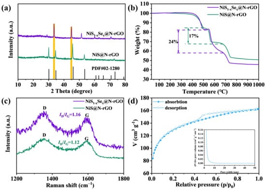 (a) XRD patterns, (b) TGA curves, (c) Raman spectra of NiS@N–rGO and NiS1−xSex@N–rGO composites. (d) N2 sorption isotherms and pore size distribution of NiS1−xSex@N–rGO composites.