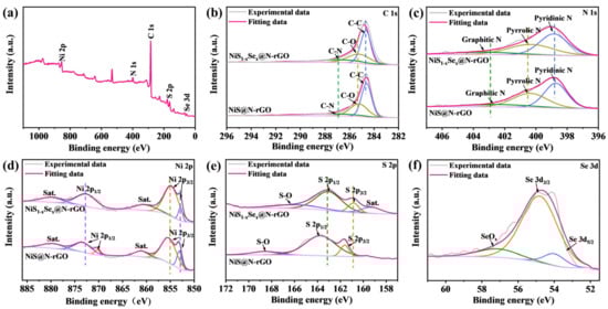 To verify the chemical state and elemental composition of obtained samples, X-ray photoelectron spectroscopy (XPS) was performed. The surface chemical composition of the NiS1−xSex@N–rGO composites can be accessed from Figure 4. It is evident that Ni, Se, S, C, and N elements all exist in NiS1−xSex@N–rGO composites (Figure 4a). Notably, the peaks positions of C 1s (Figure 4b) and N 1s (Figure 4c) in NiS@N–rGO and NiS1−xSex@N–rGO composites are well in accordance with each other, suggesting the consistent chemical states of N–rGO in them. As seen in Figure 4b, three peaks located at 284.6, 285.6, and 286.3 eV were ascribed to the C–C, C–O, and C–N bonds, respectively [24,41]. As for the N 1s XPS spectrum in Figure 4c, three peaks at 399.0 eV, 400.8 eV, and 402.6 eV were assigned to pyridinic N, pyrrolic N, and graphitic N, respectively [43]. Importantly, due to the existing of the conjugation between the lone pair of electrons of the N atom and large π-bonds of the reduced graphene oxide lattice, the nitrogen doped in the reduced graphene oxide can enhance the electronic conductivity and provide more reactive sites [23,27,44,45,46,47].