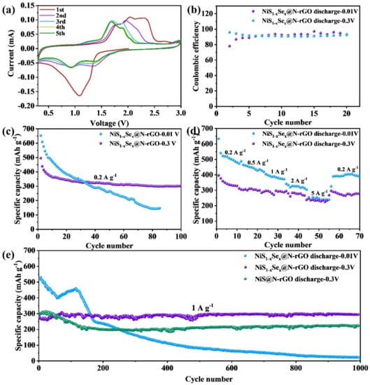 (a) CV curves at 0.3–3 V of NiS1−xSex@N–rGO. (b) Coulombic efficiency at 0.2 A g−1. (c,d) the cycling performance at 0.2 A g−1 and rate performance of the NiS1−xSex@N–rGO electrode at different cut-off voltages. (e) The cycling performance of NiS1−xSex@N–rGO and NiS@N–rGO electrode at 1 A g−1.