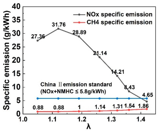 Lean burn technology can increase the total mass of the working fluid in the cylinder, which increases the heat capacity, so the combustion temperature is low, and the NOx emission can be reduced [4]. The lean burn technology is conducive to full combustion, can achieve higher thermal efficiency, and reduce the emission of unburned HC. The application of lean burn on the one hand can avoid the use of aftertreatment equipment to reduce costs, on the other hand, can make the engine achieve higher economy performance [5,6].