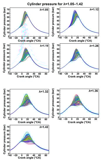 Figure 4 shows the cylinder pressure curves of 140 continuous cycles of the engine under different λ conditions, as can be seen from the figure, with the increase in λ, the distribution of the cylinder pressure curve is gradually dispersed, the combustion process is gradually delayed, the probability of incomplete combustion increases, and there will be more serious fire and post-combustion phenomena. In order to quantify the cyclic variation, we count the IMEP of each cycle under different working conditions, the COV of IMEP is an important index to measure the cyclic change. The calculation formula of COV is as follows: