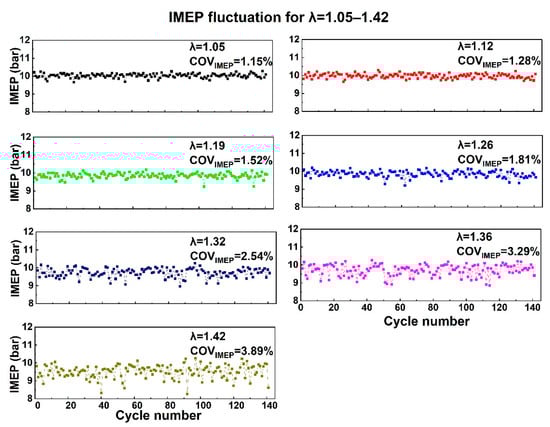 Among them, COV is the coefficient of cyclic variation, is the average value of variables, σ is the standard deviation, and N is the number of samples. Figure 5 shows the fluctuations of engine IMEP under different λ. As λ rises, the IMEP fluctuates more dramatically, and COV also increases, resulting in engine power loss, deterioration of thermal efficiency and rise of HC emission. With the further increase of COV, the engine may not be able to run stably. The IMEP is the most important index to measure the single cycle working condition of the engine. However, the fluctuation of any variable in the working process of the engine may cause it to change, including the fluctuation of air volume, the fluctuation of fuel quantity and the change of combustion phase. Therefore, with IMEP as a separate variable, it is hard to tell what exactly caused the change and how well each factor is related to it.
