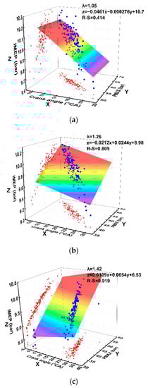 Figure 6 shows the fittings of IMEP and PMAX distributions when λ is 1.05, 1.26 and 1.42. As can be seen from the projection on the XY plane, PMAX decreases as the crank angle increases. It can be seen from the projection of the YZ plane that when λ is 1.05, the correlation between IMEP and PMAX is relatively weak, and as λ increases, IMEP gradually shows a linear relationship with PMAX. From the fitting degree, when λ is 1.05, the correlation between IMEP and PMAX distribution is low, and the fitted R–S value is 0.414. This is because the variation in IMEP and PMAX has definite randomness, but under this condition, the fluctuation range of PMAX and IMEP is small, and its random fluctuation to a certain extent obscures its internal correlation, so it is difficult to clarify its correlation by fitting. However, with the increase of λ, the distribution degree of PMAX expands, gradually showing the correlation between PMAX distribution and IMEP. When λ is 1.26, the fitted R–S value reaches 0.805, and the goodness of fitting between IMEP and PMAX distribution reaches 0.919 when λ is 1.42.