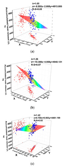 Fitting of CA50-CA05 and PMAX distribution under different λ: (a) The fitting of CA50-CA05 and PMAX at λ = 1.05; (b) The fitting of CA50-CA05 and PMAX at λ = 1.26; (c) The fitting of CA50-CA05 and PMAX at λ = 1.42.