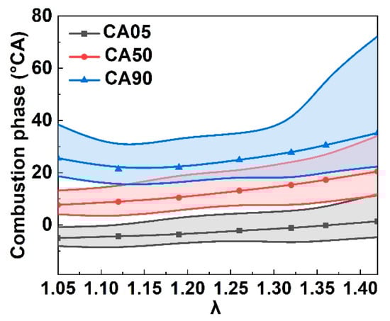 Figure 8 shows the combustion phase and fluctuation range under different λ. It can be seen from the figure that with the increase in λ, the combustion phase tends to be gradually delayed. At the same time, the fluctuation range of CA05, CA50 and CA90 is also increasing, indicating that the cyclic variation of combustion is gradually increasing. To further explore the correlation between combustion phase and cyclic variation, it is necessary to analyze the combustion parameters and their corresponding PMAX distributions.