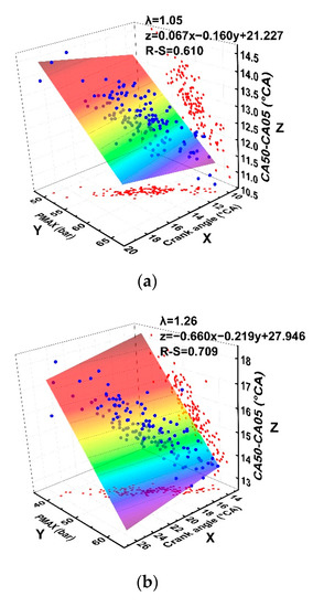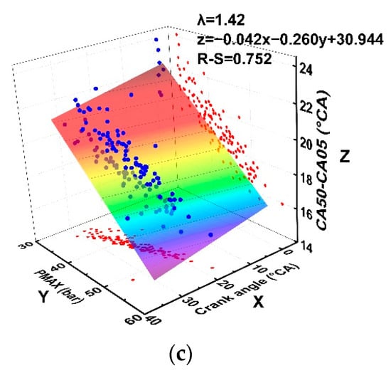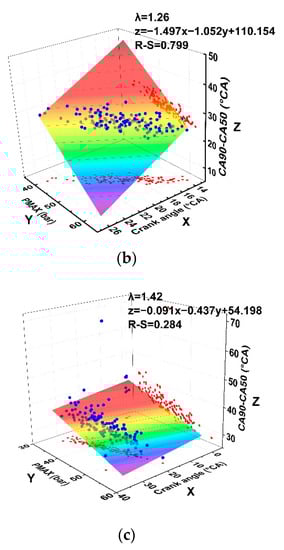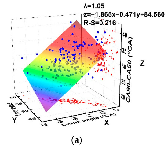 Figure 11 shows the relationship between CA90-CA50 and PMAX distribution when λ is 1.05, 1.26 and 1.42. From the projection of the YZ plane, when λ is 1.05, the correlation between CA90-CA50 and PMAX is low. When λ is 1.26 and 1.42, CA90-CA50 has a certain degree of linear relationship with PMAX. Table 10 shows the fitting of CA90-CA50 and PMAX distribution under different λ. When λ is 1.05 and 1.12, the R-S value is low, because the engine cyclic variation is small at this time, and the correlation between the parameters and the cyclic variation is hidden. The low R-S values at λ of 1.36 and 1.42 are due to the occurrence of misfire cycles resulting in individual extreme parameters. It can be seen from the figure that when λ is 1.42, there is a good correlation between CA90-CA50 and PMAX, but the goodness of fit is reduced due to the existence of individual extreme parameters. From the point of view of combustion, it can be understood that the distribution of PMAX is mainly affected by the ignition delay and the burning rate.