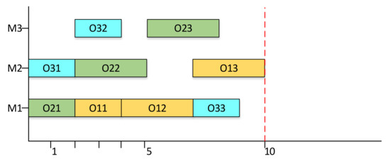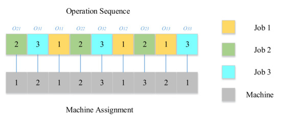 A suitable coding method can effectively solve the combinatorial optimization problem. This paper illustrates the coding method with a specific instance. Table 3 is an instance of FJSP with a scale of 3 × 3 (job × machine), and Figure 1 is the optimal scheduling scheme of Table 3. Figure 2 is the coding method of the scheduling scheme of Figure 1, which is divided into the corresponding operation sequence and machine sequence. The second “2” of the operation sequence means the second operation of job 2, and the corresponding “2” of the machine sequence means that is processed on machine . The processing order on machine is , the processing order on machine is , and the processing order on machine is .