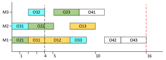 Method III: Reschedule the newly inserted job and the operations that have not started processing. According to Equation (2), determine the operations that have not started processing in the original scheduling plan, and represents the insertion time of the new job. Figure 4 shows the new scheme obtained by rescheduling when a new job is inserted. Figure 5 is the coding method corresponding to Figure 4, and the red dashed box is the operations after rescheduling. Compared with methods I and II, method III can complete the processing of all jobs in the shortest time and has higher stability. Therefore, this paper uses method III to study dynamic scheduling.