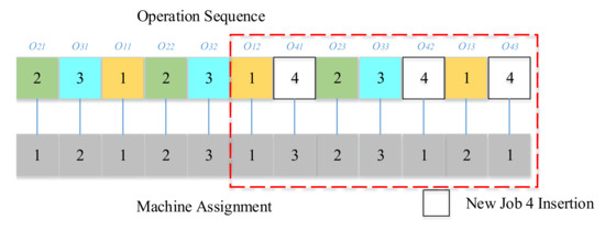 At present, there will be unexpected situations of new job insertion in real job-shops [32,33]. When a new job is inserted at a certain moment, through reasonably adjusting the processing sequence of the new and old jobs, and the corresponding relationship between the operations and the machines, the makespan can be effectively reduced and the efficiency in the flexible job-shop can be improved. Through the description of three methods for dynamic scheduling of job-shop tasks [20,34,35], the dynamic scheduling method adopted in this paper is determined. Table 3 is an instance of FJSP, and Table 4 shows the newly inserted job.