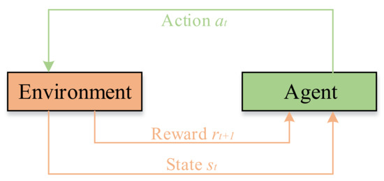 The Q-learning algorithm has a strong real-time learning ability as an RL algorithm. Its goal is to learn a strategy in interaction with the environment to obtain the maximum long-term reward [41,42]. Figure 6 shows the principle of the Q-learning algorithm, in which the agent and environment are the main components of Q-learning. First, the environment passes its state to the agent. Then, the agent selects the corresponding according to , and the environment generates the corresponding reward according to . Then, the agent selects according to reward and state of the environment at the next moment. In this way, Q-learning will eventually choose the most appropriate action according to the state at a certain moment.