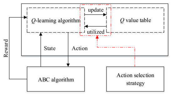The ABC algorithm is a widely used intelligent optimization algorithm. In each iteration, the population’s overall fitness is optimized by updating the m dimension. The m of the traditional ABC algorithm is unchanged or set in advance, which makes it have low convergence accuracy. As a reinforcement learning algorithm, the Q-learning algorithm can select the most suitable update dimension from the Q value table and give it to the ABC algorithm after a certain amount of learning and accumulation, which can solve the shortcomings of the ABC algorithm. Therefore, this paper applies the Q-learning algorithm to run the ABC algorithm. In the early stage, through continuous learning and recording of the dimension m in the iterative process, the optimal value of m suitable for each iteration is found to speed up the convergence and improve the accuracy of the ABC algorithm. Figure 7 is the combination model of the ABC and Q-learning algorithms. The Q-learning algorithm selects an action randomly or from the Q value table according to the state of the ABC algorithm, where the action is m during the iteration of the ABC algorithm. After the ABC algorithm executes the action, a reward will be generated. The positive or negative reward depends on whether the population’s fitness improved. Q-learning updates the Q value table according to the reward and finally forms an optimal correspondence between state and action. The action selection strategy determines whether Q-learning randomly selects an action or uses the Q-value table to select an action. The following paper will make a specific design of the state, action, reward, and action selection strategy.