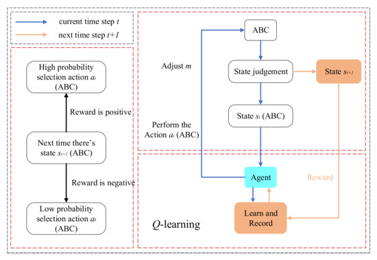 Figure 8 is a schematic diagram of the SLABC algorithm, a combined algorithm of ABC and Q-learning. The agent of the Q-learning algorithm selects an action (i.e., m) according to the state of the ABC algorithm. Then, the ABC algorithm changes its state by updating the number of m dimensions in the t-th iteration, resulting in a state at a new moment. Compare state with , generate a positive or negative reward , update the Q value table by the reward, and then the agent will choose action according to . Follow the above steps to finally complete all the iterations of the ABC algorithm.