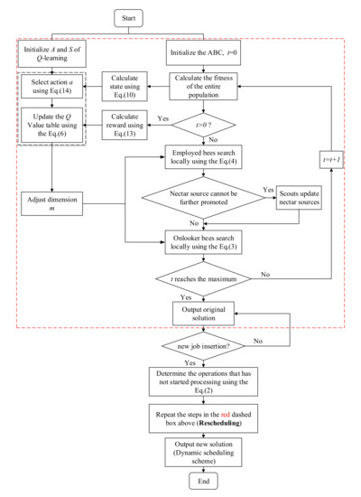 The artificial bee colony algorithm was proposed by Karaboga et al. [21] in 2005. Due to its advantages of strong stability and few parameters, the ABC algorithm has received extensive attention and research by scholars [20]. For more than ten years, many researchers have applied the ABC algorithm and its improved algorithm to FJSP, and have achieved practical achievements. Li et al. [22] proposed an improved ABC algorithm using a two-dimensional vector coding method, aiming at the minimum energy consumption and the shortest makespan, taking into account important factors such as job preparation time, which improved the local and global search capabilities of the ABC algorithm. Pan et al. [23] developed an adaptive strategy aiming at the shortest total time of earliness and tardiness, which improved the diversity of the population and enhanced the local reinforcement ability, and solved the job-shop scheduling problem using the discrete artificial bee colony (DABC) algorithm. Meng et al. [24] proposed a hybrid ABC algorithm with the goal of minimizing the total flowtime, which balances the local and global search by dynamically adjusting the search range and increases the diversification of the population. Zhang et al. [25] improved the ABC algorithm to solve stochastic FJSP, and finally obtained the solution with the shortest lateness by screening the solutions and reducing the computational load with the K-armed bandit model. Zheng et al. [26] optimized the population of ABC algorithm by using chaos theory, left-shift strategy and crossover operation with the goal of minimum makespan. This method accelerates the convergence speed of the algorithm, improves the ability of global search, and solves the fuzzy FJSP problem. Gu [27] used adaptive neighborhood search strategy and greedy method to optimize the population of ABC and retain the optimal solution, which prevented the loss of the optimal solution and solved the multi-objective low-carbon FJSP. However, it can be seen from the above researches that most of the parameters of the improved ABC algorithm are set in advance or unchanged, and are not adjusted with the change of the population state, which limits the performance improvement of the ABC algorithm. The Q-learning algorithm, as a reinforcement learning algorithm, focuses on online learning and can maintain a balance between exploration and exploitation. Learning information and updating parameters can be obtained by receiving rewards from the environment for actions [28]. Therefore, the Q-learning algorithm provides the possibility to dynamically adjust the update dimension of the ABC algorithm by virtue of its learning ability. In addition, in view of the frequent insertion of new jobs in the actual flexible job-shop, it is necessary to study an algorithm to solve the dynamic scheduling problem of the job-shop.