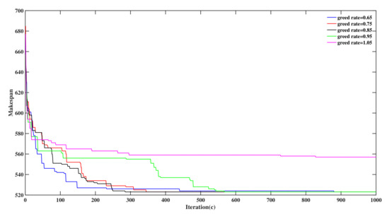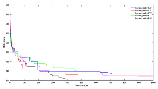 With the continuous development of computer technology, many intelligent algorithms have been applied to combinatorial optimization problems, such as the particle swarm optimization (PSO) algorithm [3,4], genetic algorithm (GA) [5,6], artificial fish swarm algorithm (AFSA) [7], Bayesian algorithm [8], ant colony optimization (ACO) algorithm [9], gray wolf optimization (GWO) algorithm [10], lion swarm algorithm [11], ABC algorithm [12,13], etc. Sabharwal et al. [14] proposed an improved GA algorithm with excellent performance, which generated the initial population through probability, avoided the error caused by the interaction between the input parameters, which solved the combinatorial optimization problem well. Wang et al. [15] optimized the ACO algorithm, changed the pheromone update mechanism, and optimized the makespan of the FJSP, overcame the shortcoming of the ACO algorithm falling into local optimum, and improved its computational efficiency. Yao et al. [16] improved the population state of GWO algorithm, and proposed the IGWO algorithm through the position-based learning strategy, which enhanced the global search ability of GWO algorithm. Wang et al. [17] proposed an adaptive multi-objective PSO algorithm with cost and tardiness as objective functions. The algorithm adopts an elite strategy and small probability mutation mechanism to avoid premature convergence of PSO and improve the convergence accuracy. Ge et al. [7] improved the AFSA algorithm with the goal of minimizing the makespan, and improved the diversity of the population by adjusting the arrangement mechanism of machines and operations. The algorithm improves its local and global search ability through attracting behavior and path search strategy, and improves the performance of the algorithm to solve FJSP. Park et al. [18] applied the same crossover strategy to the categorical part and sequential part, and proposed a unified GA algorithm, which simplified the structure of GA and effectively explored the search space of FJSP. It can be seen from the above literature that the key parameters of most algorithms are set in advance, and their adjustment methods are difficult to reasonably determine [19]. In addition, some improved algorithms have too many input parameters, and their stability needs further research and verification [20].