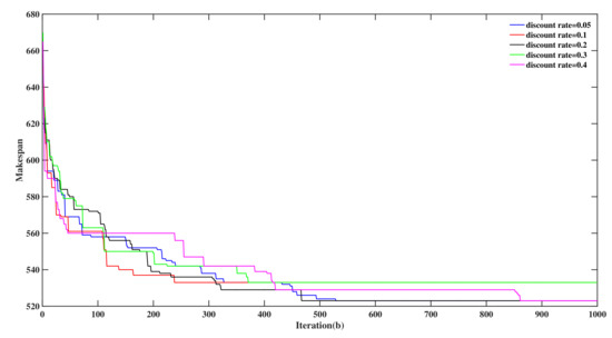 This paper determines the parameters required to run the DSLABC algorithm, including the discount rate, iteration times, learning rate, and greed rate. Experiments are carried out to determine the specific values of the parameters, as shown in Figure 10, Figure 11, Figure 12 and Figure 13. In Figure 10, Figure 11 and Figure 12, the variables are the learning rate, discount rate, and greed rate, respectively, while keeping the other variables unchanged. To maintain accurate convergence accuracy and faster convergence speed, the specific values of the parameters are shown in Table 7. Figure 13 is the convergence diagram of the algorithm for 2000 iterations. The algorithm reaches convergence after approximately 500 iterations. To ensure that the algorithm can reach the final convergence and shorten the algorithm’s running time as much as possible, the number of iterations is selected as 1000 in this paper. In addition, the population size is set to 400, the initial reward is set to 1, and the number of runs is set to 20.