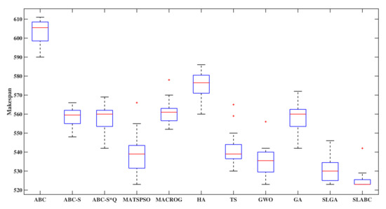 The SLABC algorithm is the core of the DSLABC algorithm, and its performance determines the performance of the DSLABC algorithm. In this paper, the performance of the SLABC algorithm is first verified by experiments. By solving 10 Brandimarte instances [44] with the shortest makespan as the goal, the comparison results of the SLABC algorithm and other algorithms are obtained. Table 8 shows the optimal solutions (second) obtained by 11 algorithms to solve 10 instances. Except for the SLABC algorithm, this paper verifies the performance of ten algorithms of TS [44], HA [45], GWO [10], GA [46], SLGA [42], MA-CROG [47], MATS-PSO [48], ABC [49], ABC-S and ABC-S*Q [41] under the same experimental conditions The optimal results are marked in brackets, and HOV represents the optimal historical value of 10 calculation instances [10]. The SLABC algorithm obtains 8 optimal solutions in 10 calculation instances, indicating that the SLABC algorithm has excellent convergence performance. By counting the results of running the MK8 instance 20 times with 11 algorithms, the boxplot shown in Figure 14 is obtained. It can be seen intuitively that the optimal value and average value obtained by the SLABC algorithm have great advantages, which further verify the convergence of the algorithm.