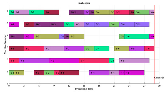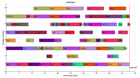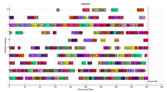 Figure 15, Figure 16 and Figure 17 show the scheduling schemes obtained by the SLABC algorithm to solve MK2, MK4 and MK9. The scales of the job-machine are 10 × 6, 15 × 8, and 20 × 10. The different colors in the figures represent different jobs, the vertical axis represents the machine, the horizontal axis represents the processing time, and represents the shortest makespan achievable through the SLABC algorithm. It can be seen from the figures that the shortest makespan of instances MK2, MK4, and MK9 reach 29, 67, and 364, respectively.