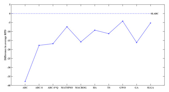 Table 9 shows the relative percentage deviation (RPD) calculated by Equation (15). The value of BV is shown in Table 8, and the optimal RPD is marked in brackets. In the last row of Table 9, the average RPD of 11 algorithms to solve 10 instances are calculated, and the gap between the average RPD of SLABC and the other 10 algorithms is compared, as shown in Figure 18. This shows that SLABC will obtain a better solution than other algorithms when solving the same scheduling problem.