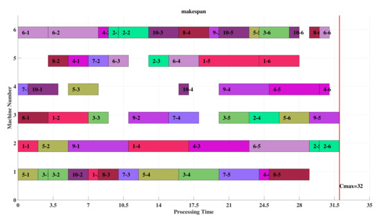 The operations of each job in the flexible job-shop can be processed on multiple machines. Therefore, the purpose of this study is to minimize the makespan through the reasonable arrangement of operations and machines [29,30,31]. The various parameters and their meanings of FJSP are shown in Table 1. In the flexible job-shop, each job consists of multiple operations, and each operation can be processed on more than one machine. In this paper, through adjusting the corresponding relationship between and , an optimal scheduling scheme is formed and the makespan is reduced. Equation (1) is the objective function of solving FJSP in this paper.