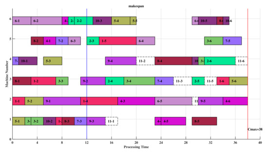 This paper provides information on instance MK2 according to the coding method. Table 10 shows the machines corresponding to each operation in MK2, Table 11 shows the corresponding time of the machines in Table 10, and there is a one-to-one correspondence between Table 10 and Table 11. For example, operation of job can be processed on all six machines. The processing time on machine is “3”. Table 12 is the newly inserted job designed in this paper, and Figure 19 is the scheduling scheme in the case of no emergent job. Figure 20 represents the new scheduling scheme obtained by adding the emergent Job 11 when the time is “12” and rescheduling the new job with the unfinished operation in the original scheduling scheme. White represents the newly inserted job. Figure 19 and Figure 20 show that the DSLABC algorithm can deal with the job-shop scheduling problem in emergencies, proving the DSLABC algorithm’s practicability.