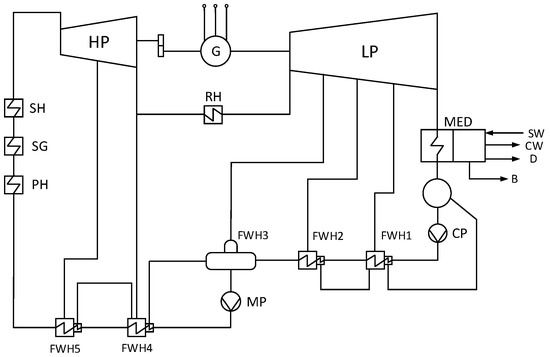 The power cycle subsystem. It consists of a regenerating Rankine cycle (Figure 2) with reheat, which consists of a train of heat exchangers (preheater (PH), steam generator (SG), superheater (SH), and reheater (RH)); a high-pressure turbine (HP); a low-pressure turbine (LP); and five feedwater preheaters (FWH1–5), including a deaerator, a condensate pump (CP), and a high-pressure/main pump (MP). The multi-effect distillation unit replaces the power cycle condenser. The nominal thermal performance is calculated for the aforementioned configuration. Regarding the operation of this subsystem out of the nominal conditions, the power curve as a function of the thermal power input given by Llorente et al. [32] has been adopted considering the nominal point calculated with the distillation unit integrated into the power block (Figure 3).