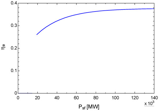 where is the specific enthalpy of the steam at the inlet of the turbine, is the specific enthalpy of the steam at the outlet of the turbine, and is the isentropic specific enthalpy of the steam (with respect to the inlet). Steam pressures extractions are selected so that the same enthalpy difference is obtained in each preheater. The efficiency of the power block (defined as the fraction of thermal power converted to electricity) (Figure 3) is calculated through Equation (5):