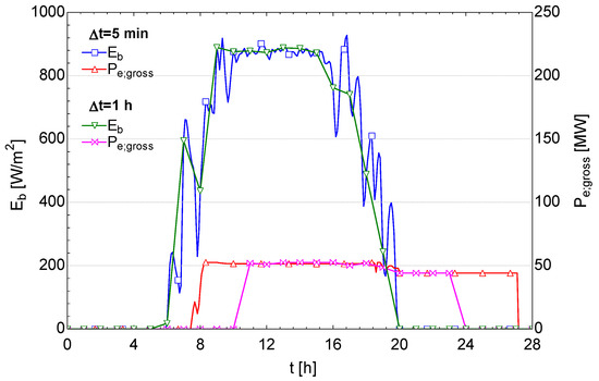 A comparison of the direct normal irradiance (DNI), , and gross electric power, , simulated with 5 min and 1 h time steps for a clear day in summer (22 June) is shown in Figure 4. The simulation was extended to 28 h in order to take into account the possible operation at night due to the TES system. Note how the 5 min DNI curve is more detailed and has more peaks than the 1 h curve, which will eventually affect the heat transfer fluid temperatures in the solar field and therefore the gross electric energy produced. The 5 min simulation takes more points in the same time interval, leading to a more accurate description of the process. As the algorithm splits the day into four periods, taking a small enough step time results in a sooner response of the HTF temperature and therefore a faster startup of the electric energy production. In addition, the gross electric power curve simulated with the 1 h time step rises later and descends earlier than in the 5 min time step case because the TES system stores less energy.