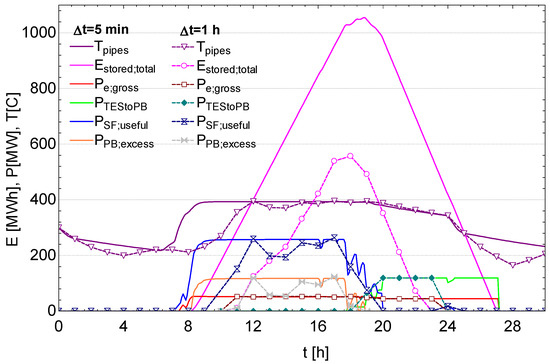 As can be seen in Figure 5, the HTF temperature in the insulated tubes () is achieved 310 °C earlier in the 5 min time step simulation than in the 1 h time step simulation and thus it is possible to produce energy earlier in the power block. Moreover, the TES system is also charged before and up to its maximum ( = 1010 MWh) thanks to the excess of thermal energy in the solar field (), which in turn leads to a long energy production after the sunset (≈20 h) than in the case of the simulation with 1 h step time. Note that the maximum power sent from the TES system to the Power Block () was limited to 119 MW, and from the solar field to 140 MW. Note also how the useful thermal power obtained by the SF () takes place approximately from 8 h to 20 h, matching the DNI availability.