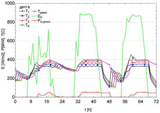 Simulation of direct normal irradiance (), HTF temperatures in a generic loop (), and gross electric power () for three days in summer, 21–23 June with a time step of 1 h.