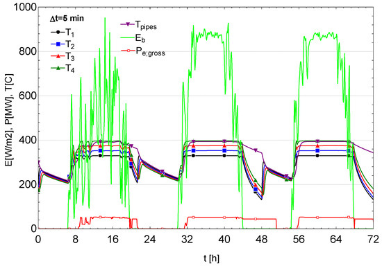Simulation of direct normal irradiance (), SCA HTF temperatures (), and gross electric power () for three days in summer, 21–23 June, with a time step of 5 min.